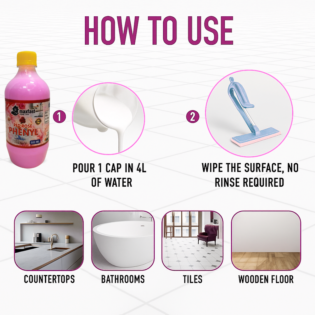 Turn everyday cleaning into a fragrant experience with Maxfast Red Rose Phenyl — a strong disinfectant cleaner infused with the refreshing aroma of roses. It ensures germ protection, removes dirt and stains effectively, and leaves behind a pleasant rose fragrance that keeps your home smelling fresh all day.