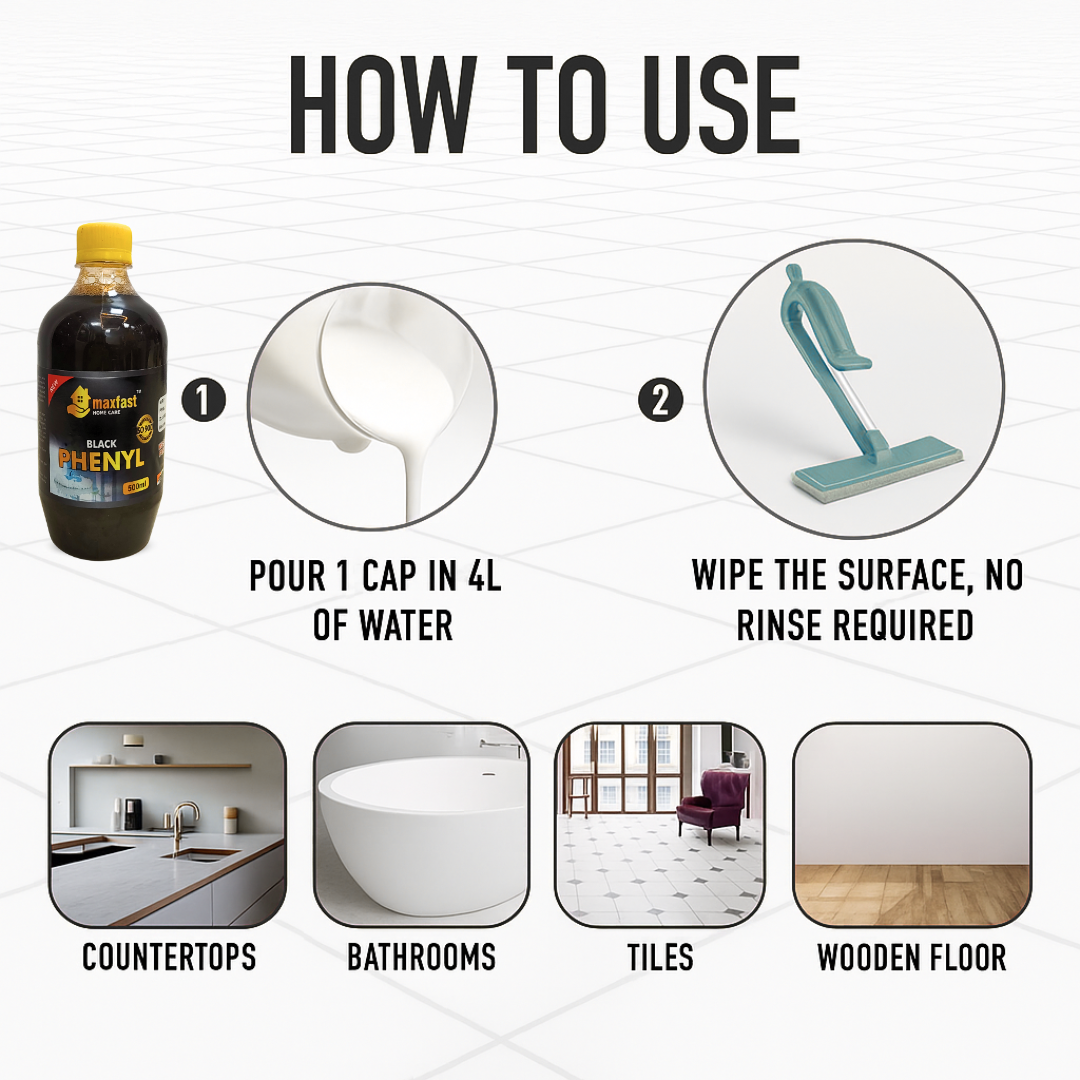 Mix 1 part Maxfast Black Phenyl with 40 parts water for daily floor cleaning.