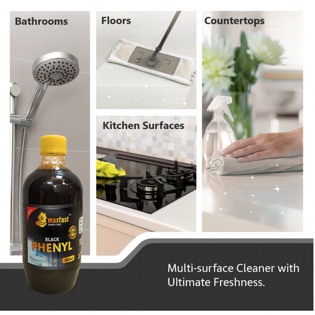 Maintain spotless, germ-free surroundings with Maxfast Black Phenyl 500 ml, a high-performance disinfectant cleaner designed to deliver exceptional cleanliness and a refreshing fragrance.