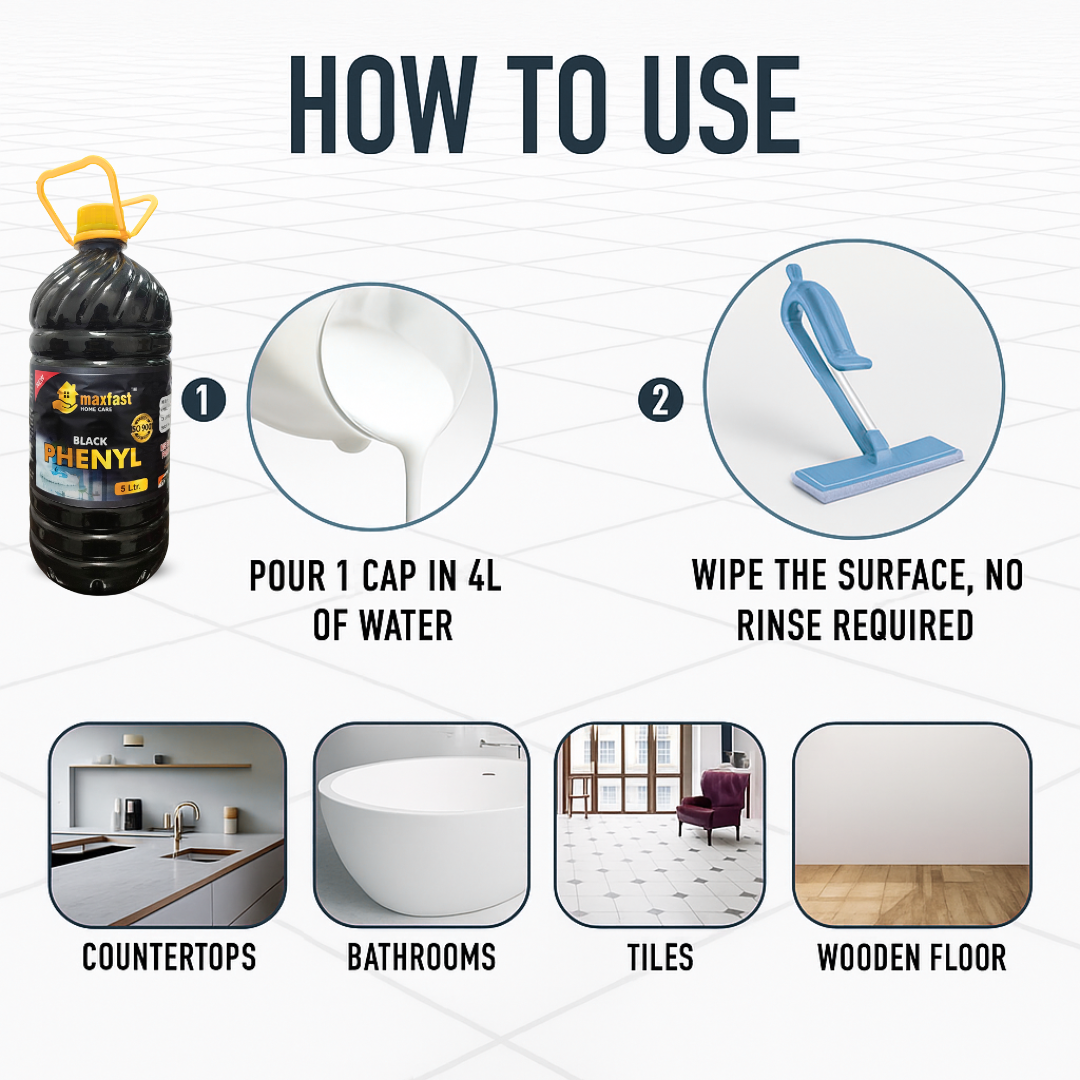 Mix 1 part Maxfast Black Phenyl with 40 parts of water for daily cleaning.